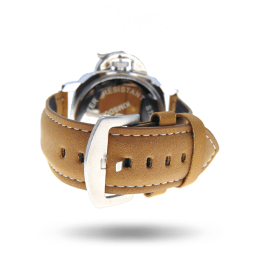Fényes ezüst színű kör alakú barna vagy fekete hasított bőr szíjas férfi óra.